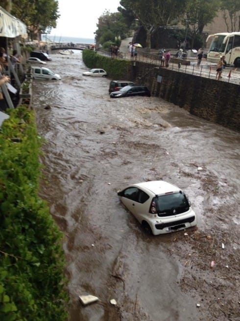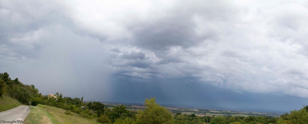 Depuis la mi-journée, la convection s'amplifie sur le sud-est de Midi-Pyrénées, notamment dans le Lauragais entre Haute-Garonne et sud du Tarn. Un système multicellulaire peu mobile évolue en générant des lames d'eau localement supérieures à 50 mm. Un peu plus tôt en fin de matinée, une cellule orageuse à tendance rétrograde et donc très peu mobile a provoqué de très fortes pluies à Servian, au nord-est de Béziers. Comme en témoigne le cliché ci-dessous de Jessica Domingo pour Midi-Libre, le cours d'eau traversant le village est rapidement entré en crue. Le cumul de pluie est estimé proche de 70 mm en moins d'une heure.