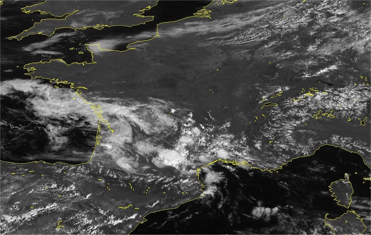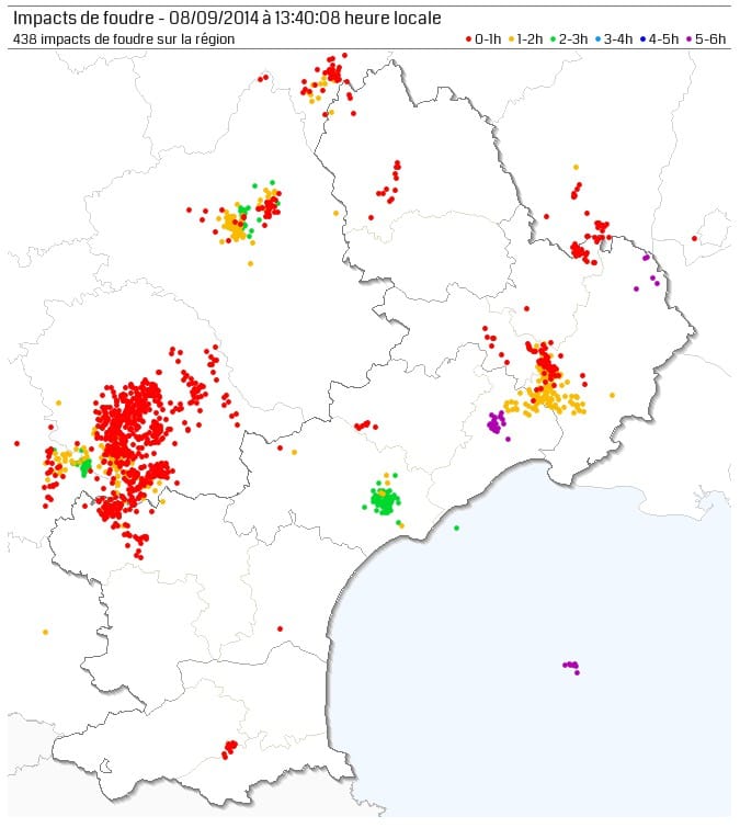 En ce milieu d'après-midi, l'activité convective a pris de l'ampleur et évolue sur l'est de Midi-Pyrénées, le Languedoc-Roussillon, l'Auvergne et l'est du Limousin. Les orages restent mal organisés, la plupart du temps sous forme de clusters multicellulaires ou de monocellules. Grêle et fortes pluies sont observées.