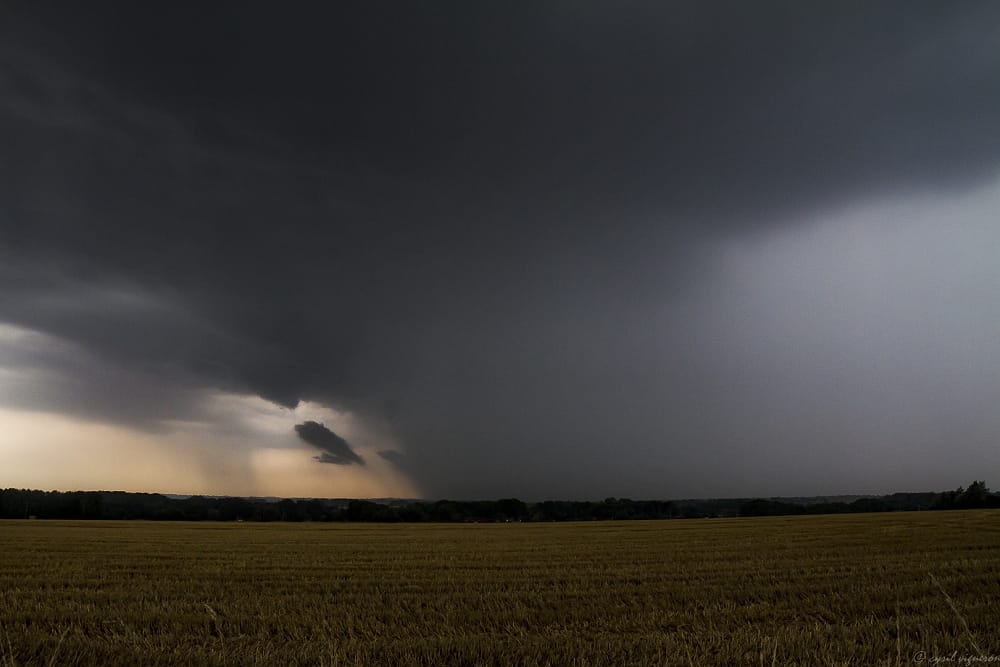 A gauche, structure orageuse menaçante et venteuse, avec soulèvements de poussières, photographiée près de Douai (Nord) par Cyril Vigneron. A droite, orage intense avec mur de pluie, dans les environs de Thun-l'Evêque (Nord) :