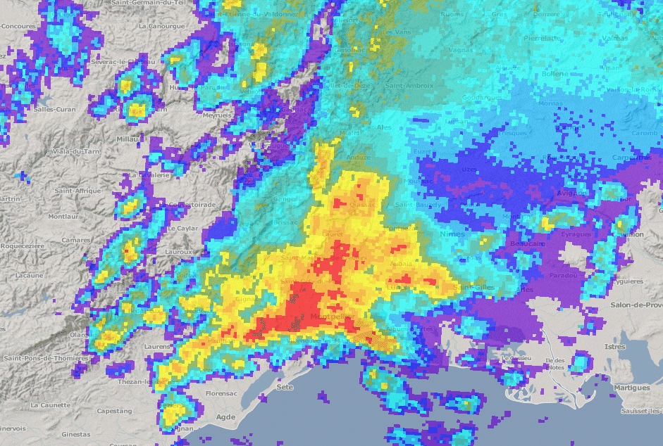 De nouveaux orages se forment par ailleurs plus à l'ouest, sur l'Hérault, où deux personnes âgées sont décédées, leur véhicule ayant été submergé par la montée des eaux. Ces orages affectent en ce moment la ville de Montpellier, qui a déjà enregistré un nouveau record de précipitations en 30 minutes en milieu d'après-midi, avec une lame d'eau de 64 mm à la station de l'aéroport (source @GaetanHeymes).