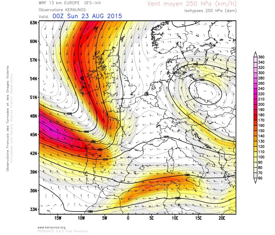 Un épisode orageux de grande envergure a balayé plusieurs régions françaises entre le soir du samedi 22 août et le soir du dimanche 23 août. L'épisode a été lié au passage d'un thalweg d'altitude très marqué, qui s'est présenté sur le proche Atlantique dans la nuit du 22 au 23 août, positionnant tout l'ouest de la France dans une configuration à la fois dynamique et instable, comme l'illustrent les champs ci-dessous, issus du modèle WRF 13 km Europe: