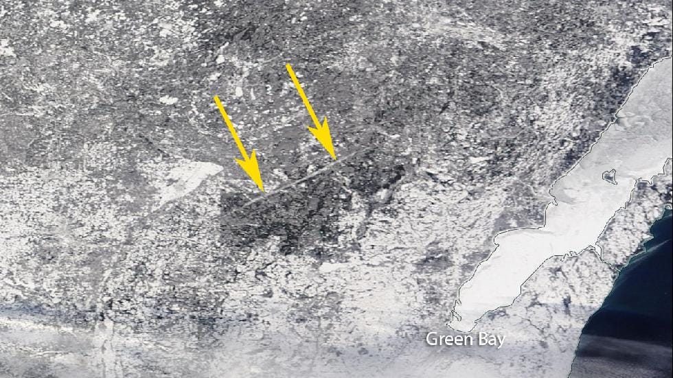 La NASA a publié une image satellite prise le 10 janvier dernier. On distingue encore clairement le couloir d'une tornade EF3 ayant soufflé sur 64 km dans le Nord-Est du Wisconsin (Etats-Unis) le 7 juin 2007. Des dizaines de milliers d’arbres avaient été déracinés. D'autres cas similaires sont présentés par The Weather Channel.