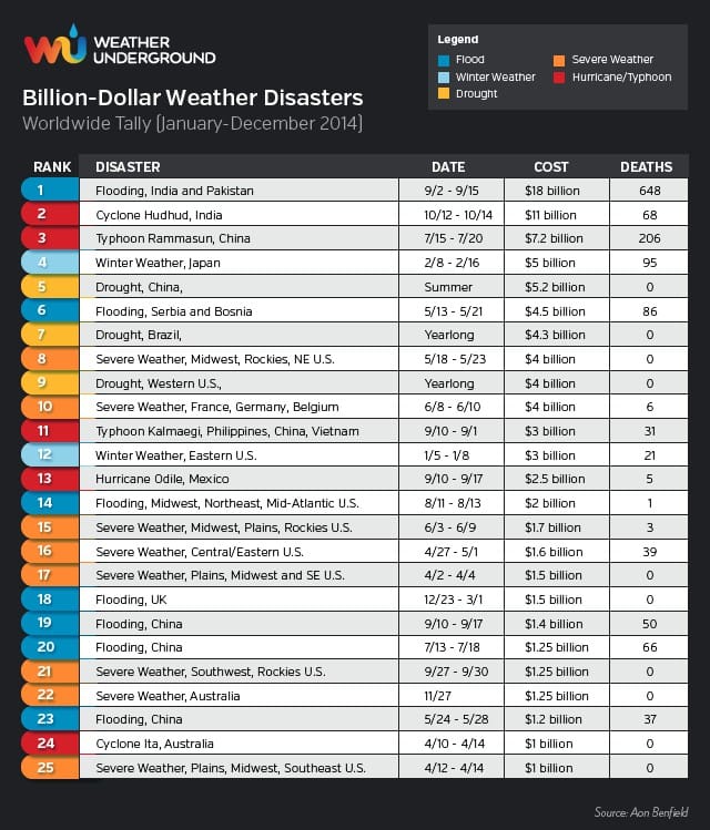 Coûts des catastrophes naturelles liées à la météo en 2014 (Weather Underground & Aon Benfield)