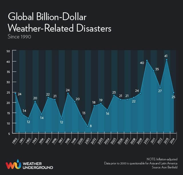 Coût annuel des catastrophes naturelles liées à la météo (Weather Underground & Aon Benfield)