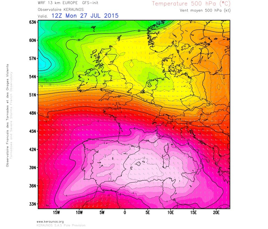 Une masse d’air remarquablement chaude en altitude a envahi ce 27 juillet toute l’Espagne et l’ensemble du bassin méditerranéen occidental. Les températures à 500 hPa (soit entre 5.800 et 5.900 mètres d’altitude) ont approché -1°C entre Baléares et Sardaigne, et oscillé entre -2 et -4°C sur l'Espagne et sur le sud de la France.Le radiosondage réalisé à Nîmes à 14h00 locales (voir ci-contre) a ainsi mesuré une valeur de -3,7°C à ce niveau, avec un isotherme 0°C rehaussé jusqu’à 4.900 mètres d’altitude.