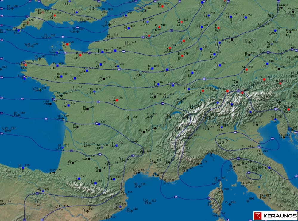 La carte pointée ci-dessous (réseau SYNOP) illustre la situation de ce 27 juillet 2015 à 05h locales. On y voit notamment le système de basse pression en transit sur les îles britanniques :