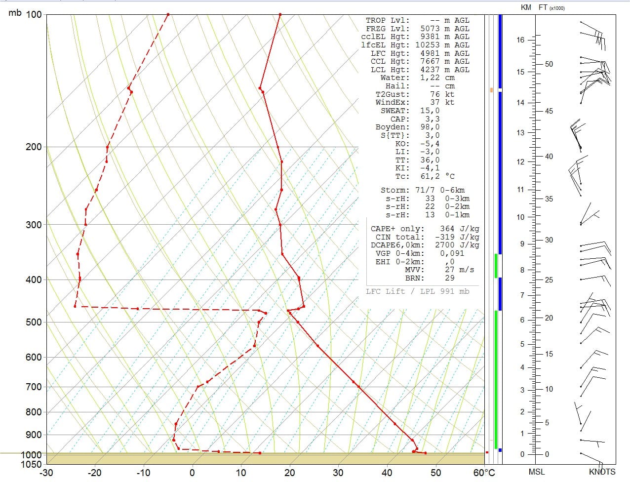 Bon nombre de stations synoptiques ont en effet dépassé les 50°C avec jusqu'à 51.0°C à Bagdad, égalant le record absolu d'août 2011 et 52.8°C à Mitribah au Koweït, soit la plus forte valeur de l'été, à 1°C environ seulement du record absolu national. Au même moment, les points de rosée étaient particulièrement bas, signe de la sécheresse extrême de la masse d'air en basse couche. A 850 hPa (environ 1500 m d'altitude), la température oscillait entre 34 et 37°C. Une température supérieure à 36°C à 850 hPa dans ce secteur semble se produire ponctuellement quelques fois par été.