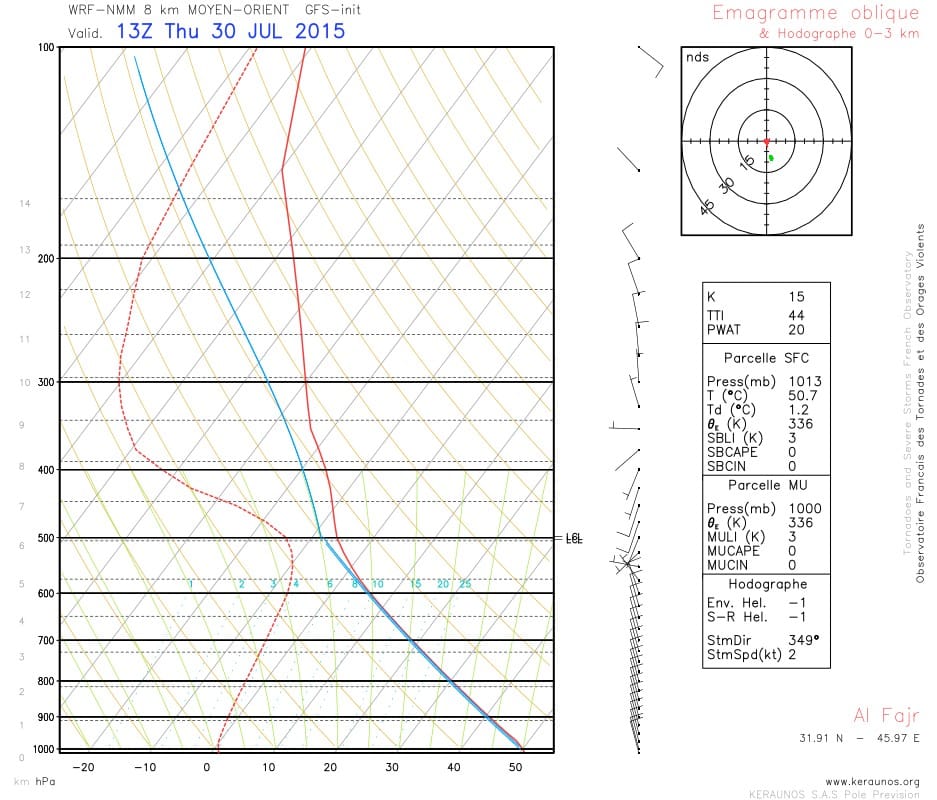 La journée du 30 juillet 2015 a été marquée par une chaleur extrême dans le Golfe Persique. Malgré la circulation de nuages d'altitude épars en raison d'une faible humidification des couches moyennes (visible sur les radiosondages présentés), le mercure est monté au-delà de 50°C entre l'Irak et le Koweït.