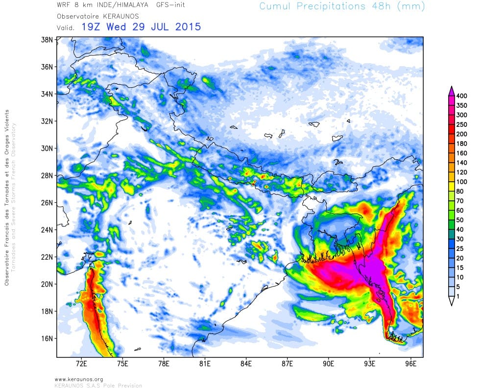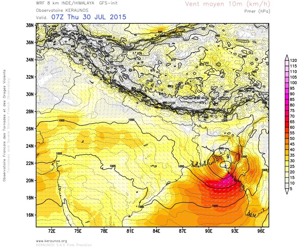 Inondations au Bangladesh suite aux pluies orageuses exceptionnelles de fin juillet 2015 - The Weather ChannelCes très forts cumuls de pluie étaient également modélisés par la version NMM du modèle WRF 8 km pour le Golfe du Bengale. Le système cyclonique est ici matérialisé lors de son entrée dans les terres au matin du 30 juillet :