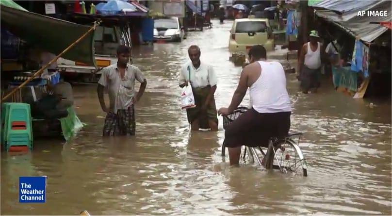 Depuis une semaine, des pluies orageuses diluviennent s'abattent sur le Golfe du Bengale, touchant le Bangladesh et une partie de la Birmanie. Entre le 29 etle 30 juillet, un système tropical (cyclone Komen) est parvenu à s'organiser dans le fond du Golfe du Bengale, générant un virulent flux d'ouest/sud-ouest en direction des côtes birmanes. Ces pluies ont provoqué la mort de plusieurs dizaines de personnes en raison de glissements de terrain et des inondations.