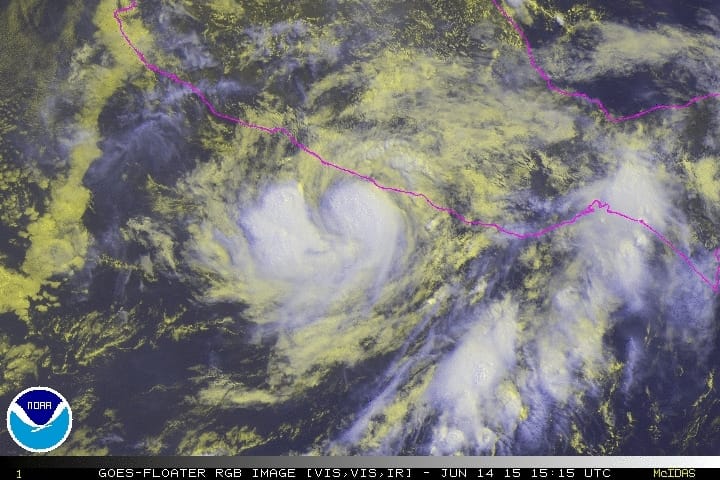 La tempête tropicale Carlos a été baptisée le 10 juin dernier par le NHC dans le bassin du Pacifique Est. Il s'agit du troisième phénomène tropical de la saison dans ce bassin. La tempête, un temps ouragan, s'est affaiblie ces dernières heures mais devrait à nouveau rejoindre les statuts de l'ouragan avant de toucher terre sur la côte sud-ouest du Mexique. Le phénomène dervait générer de très fortes pluies, probablement supérieures à 200 mm localement. Les vents sont prévus atteindre 130 km/h en vitesse moyenne sur 1 min, avant de faiblir rapidement lors de l'entrée dans les terres montagneuses de la Sierre Madre.