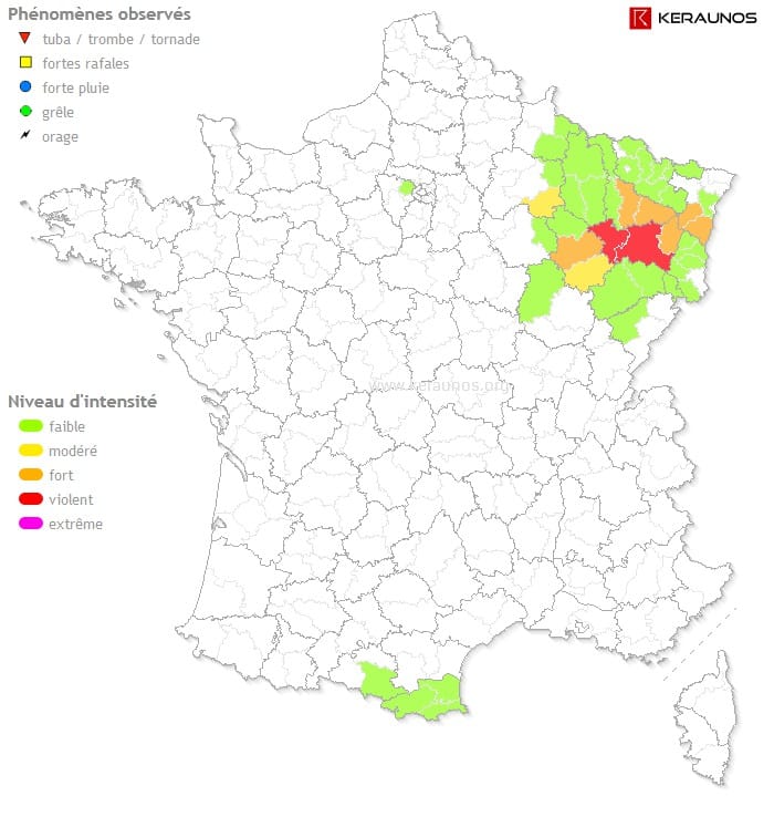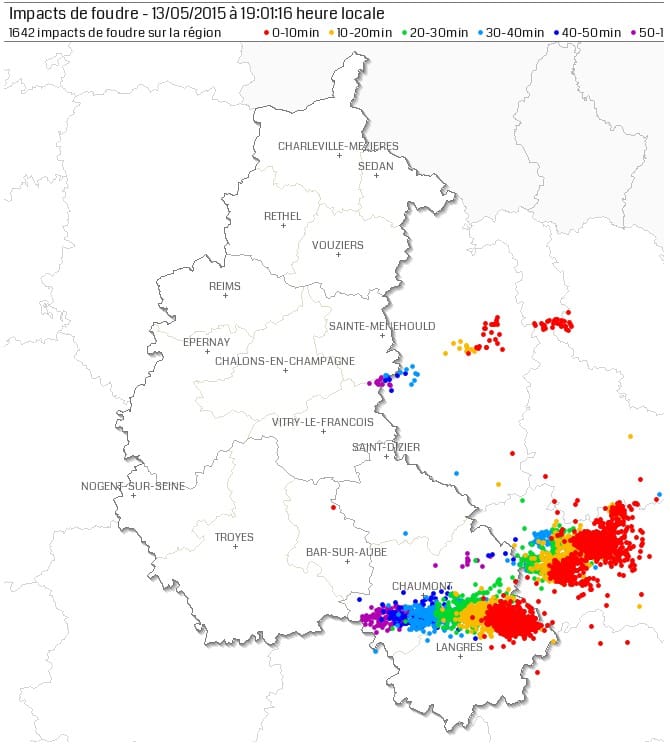 Les supercellules qui circulent entre sud Lorraine et Alsace conservent une forte activité actuellement. Les pluies et les chutes de grêle associées sont localement violentes. De nouvelles structures supercellulaires ont réussi à aboutir en Haute-Marne ; elles se dirigent désormais à leur tour vers les Vosges.