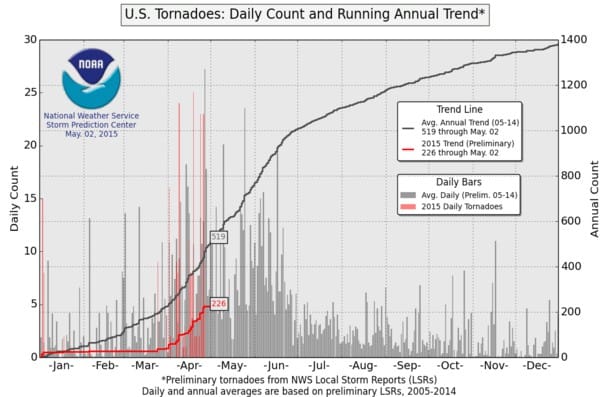 Au 2 mai, le nombre de tornades documentés depuis le 1er janvier aux Etats-Unis (226) reste bien inférieur à la moyenne 2005 / 2014 (519).