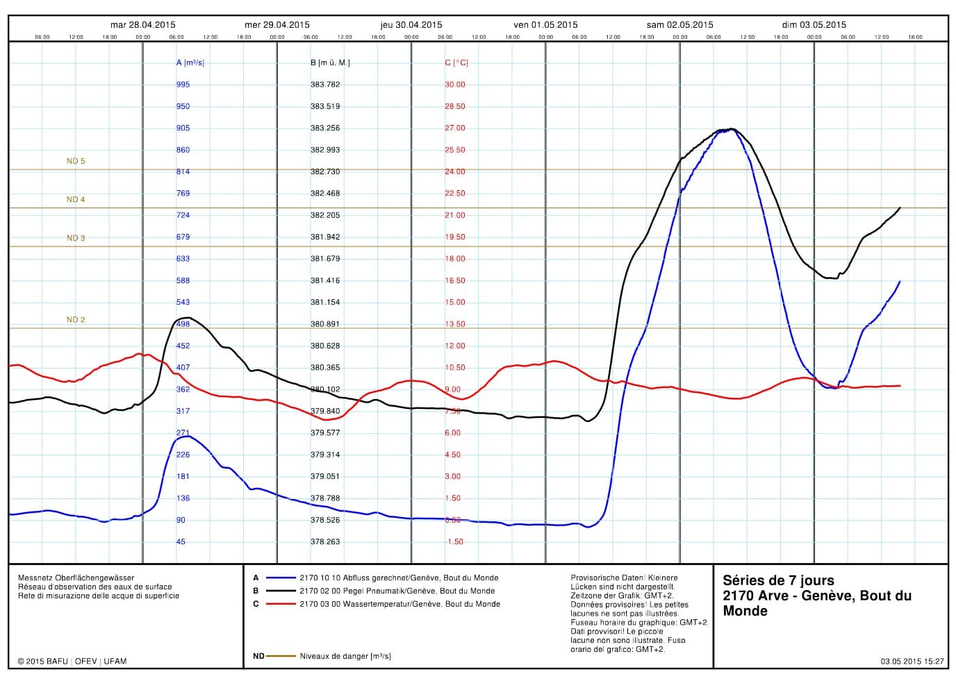 Un épisode de très fortes pluies orographiques a concerné les reliefs des Vosges, du Jura et des Alpes du Nord du 30 avril au 1er mai. Le massif du Chablais a été le plus arrosé avec, en 30 heures, jusqu'à 190 mm relevées côté français sur station météo des Gets (Haute-Savoie) et jusqu'à 239 mm côté Suisse sur la station Météo-Suisse du barrage de Clusanfe. En bassin versant du Chablais, l'Arve a connu une crue historique en atteignant un débit de 905 m3/s sur la station du Bout du Monde à Genève, un niveau dépassant une période de retour de 100 ans et jamais observé depuis le début des mesures en 1935. De fréquents éboulements de terrain ont par ailleurs été constatés entre Isère, Savoie, Haute-Savoie, Jura et Valais. Nonobstant, l'activité électrique a été très faible durant cet épisode avec quelques impacts de foudre sur la Savoie en cours de nuit du 2 au 3 mai.