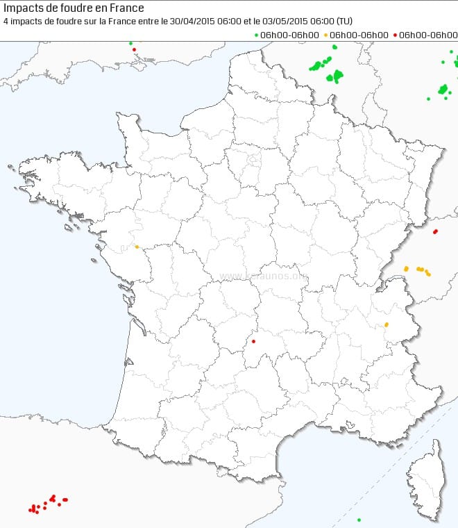 Décharges électriques du 30 avril au 2 mai 2015 détectées par Blitzortung - Lightning Maps