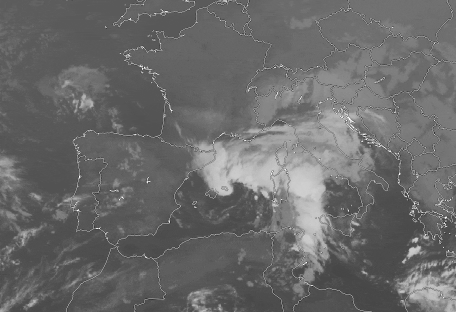 L'image satellite IR transmise par Andreas Hostettler permet quant à elle de distinguer le centre dépressionnaire qui est temporairement devenu un peu plus apparent en cette fin d'après-midi. On note toutefois une déstructuration rapide de la convection à mesure qu'elle gagne l'intérieur de la Sardaigne.