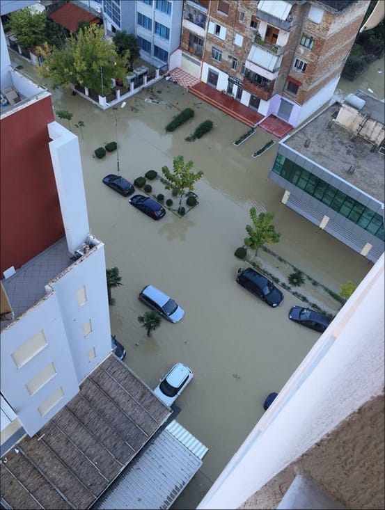 Inondations en Albanie à Vlore. Photo @JuxhinCelaEU et orages vus depuis l'ISS dans la nuit du 10 au 11