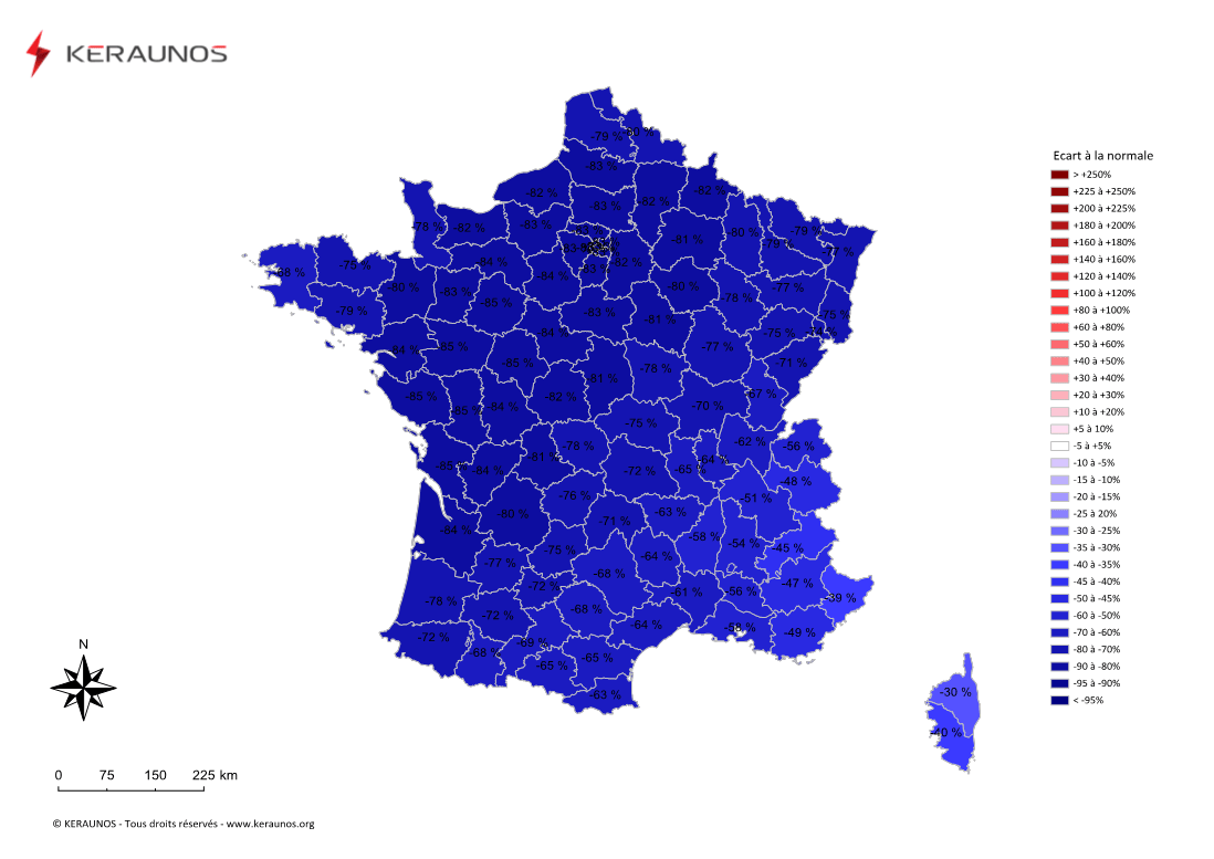 Il s'avère que la situation la plus exceptionnelle a été enregistrée sur le Bas-Rhin : même si le déficit enregistré sur ce département (-77%) n'est pas le plus marqué en France en valeur absolue, il s'agit néanmoins du 2ème début de mois d'août le plus stable depuis 70 ans sur ce secteur.