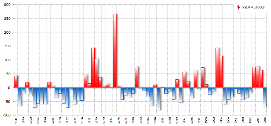 Ecart à la normale de l'instabilité en France sur la période du 1er au 12 août, depuis 1948.