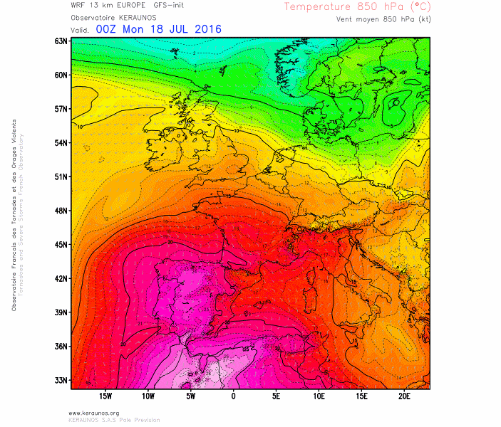 Température prévue vers 1500 mètres d'altitude pour ce mercredi 20 juillet 2016 en fin de matinée. Modèle WRF 13 km Europe.