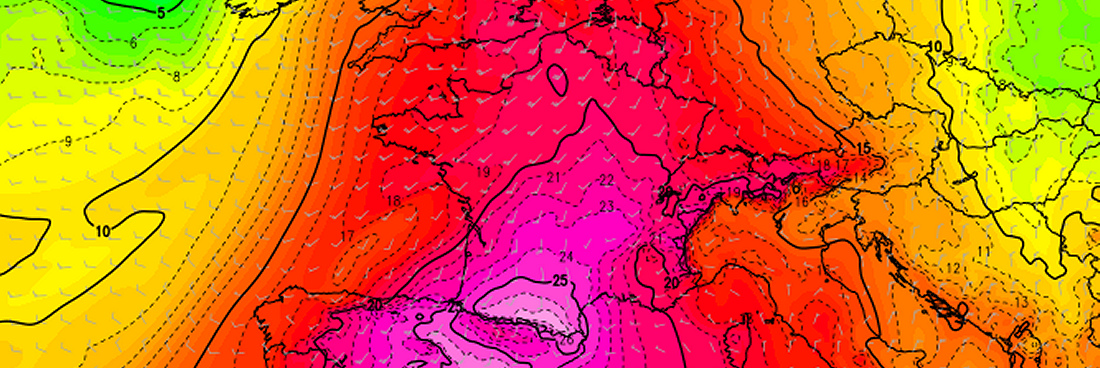 Comme l’illustre l’animation ci-dessous (modèle WRF 13 km Europe), la température vers 1500 mètres d’altitude (850 hPa) va avoisiner ou dépasser 20°C sur la majeure partie du pays en ce début de semaine, avec des valeurs parfois supérieures à 25°C près des Pyrénées, soit des valeurs particulièrement élevées.