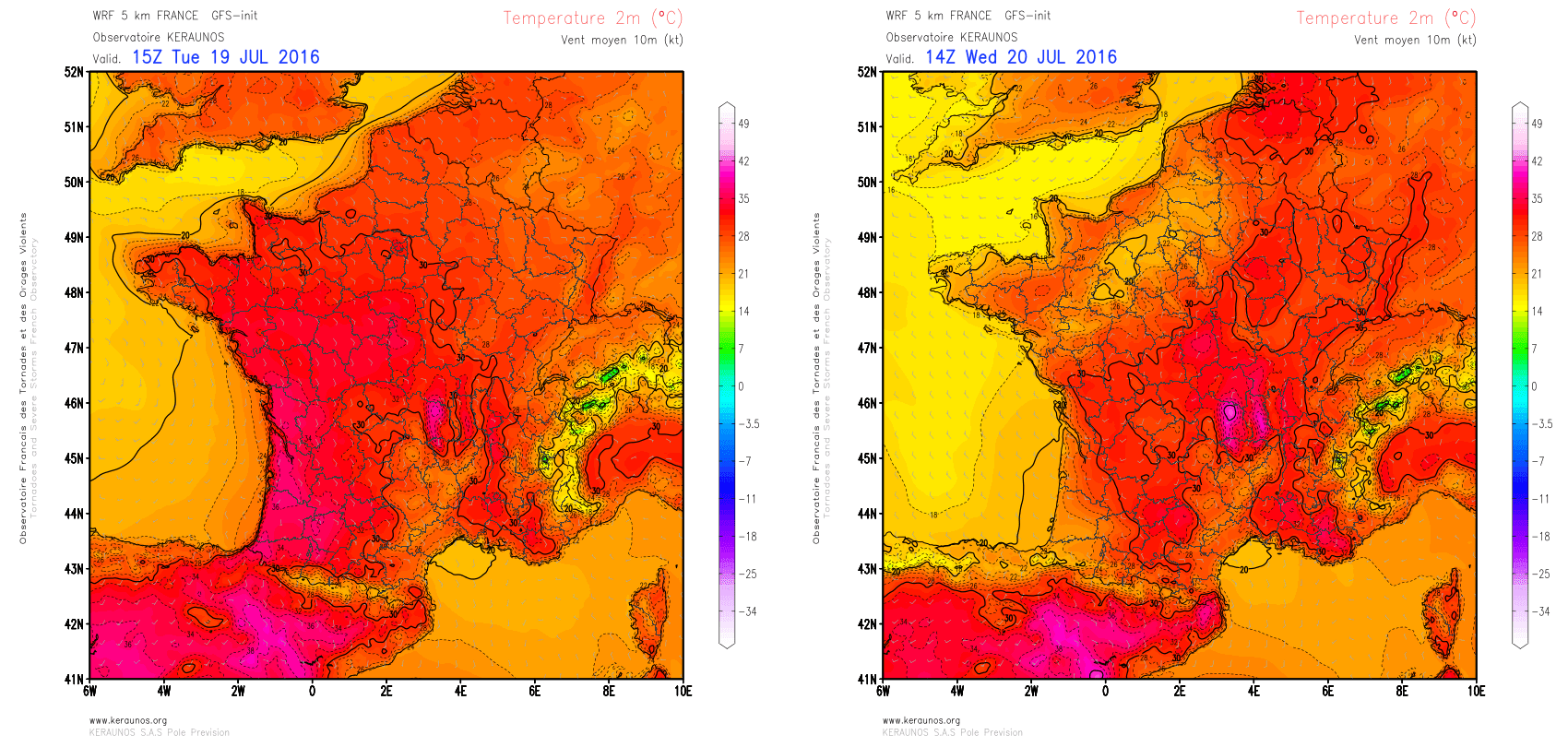 Au niveau du sol, la chaleur va devenir intense, avec des valeurs qui dépasseront fréquemment 30°C chaque après-midi. Ainsi, par exemple, le nouveau modèle WRF 5 km France, actuellement en phase de test avant usage opérationnel, anticipe des pointes entre 37 et 38°C sous abri en Aquitaine mardi après-midi, puis entre 40 et 41°C sur le nord de l’Auvergne mercredi :