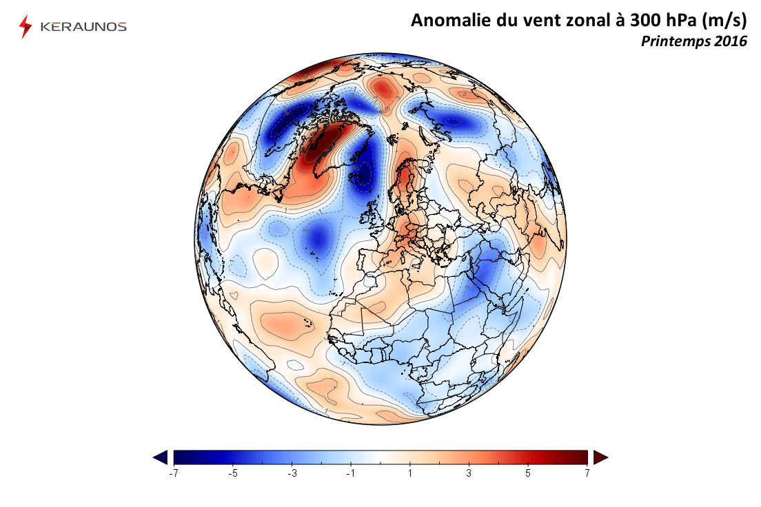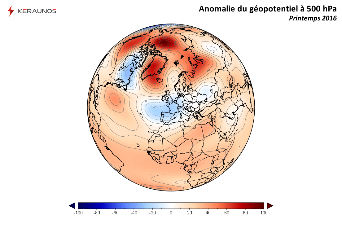 En moyenne, sur ces trois mois, les bas géopotentiels ont été dominants sur l'ouest de l'Europe et a fortiori sur la France, soit l'inverse du printemps 2015.