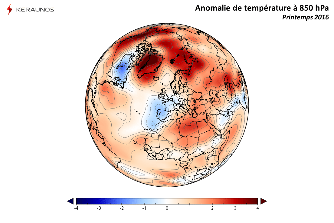 Les deux cartes ci-dessous présentent l'anomalie de l'instabilité de la masse d'air et de la température vers 1.500 mètres d'altitude au cours du printemps 2016.