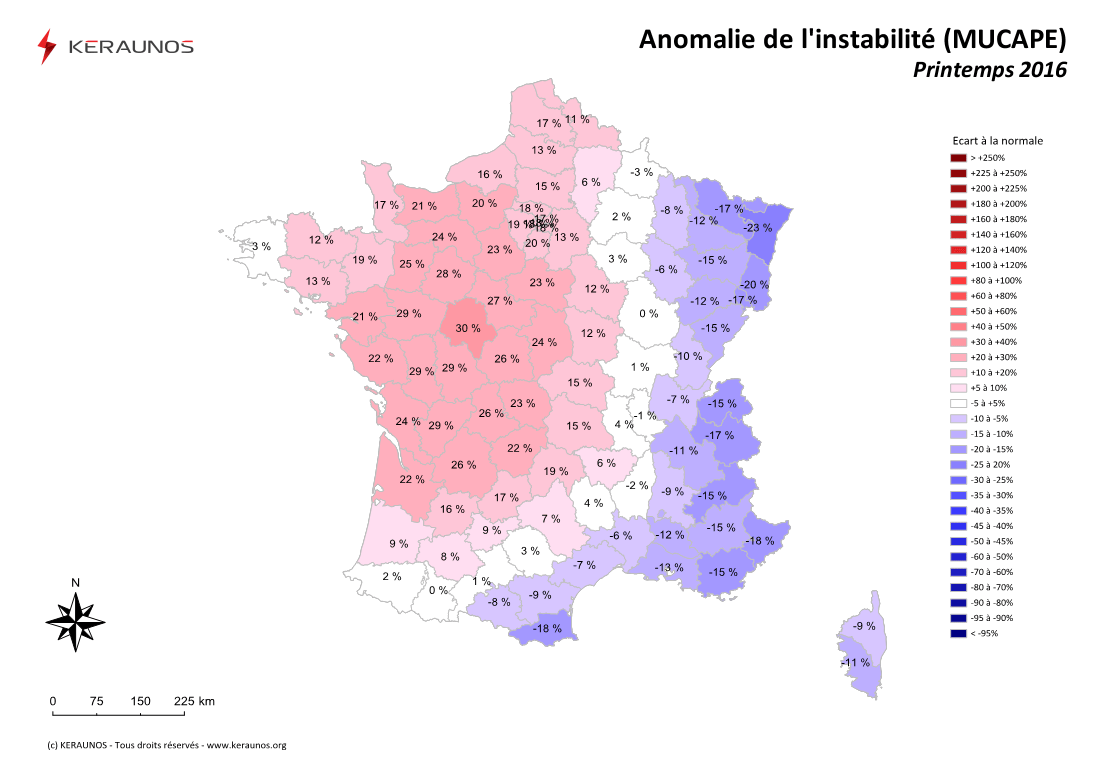A échelle nationale, le printemps 2016 présente une instabilité très légèrement supérieure à la normale avec un excédent de +7%. Ce printemps globalement proche de la normale en terme d'instabilité contraste avec le printemps 2015, qui fut le plus stable depuis 1997.