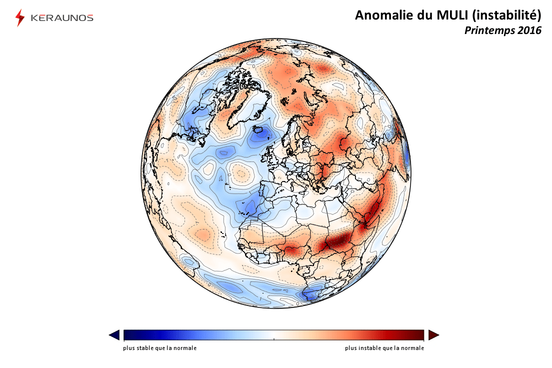 On constate globalement une instabilité proche de la normale sur la France, déficitaire sur l'Espagne mais excédentaire sur l'est de l'Europe. Après un hiver exceptionnellement doux, les basses couches ont été plus fraîches que la normale durant le printemps, avec un déficit vers 1.500 mètres qui avoisine -0,5°C sur les régions de l'ouest. Mais le gradient thermique vertical (grâce à l'air encore plus froid en altitude) a tout de même favorisé les développements convectifs.