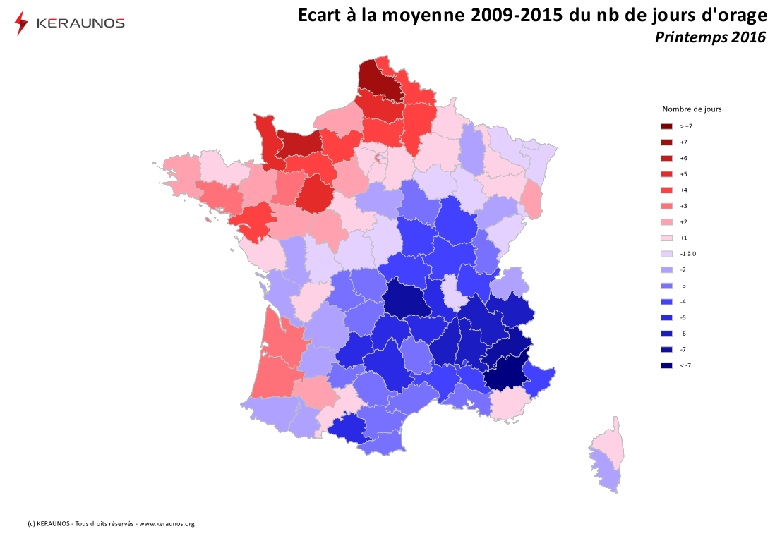 Sur les trois mois de printemps, la France a compté 79 jours d'orage, soit 11 jours de plus que la moyenne 2009-2015. Ces valeurs sont très supérieures à celles relevées lors du printemps 2015 anormalement peu orageux.