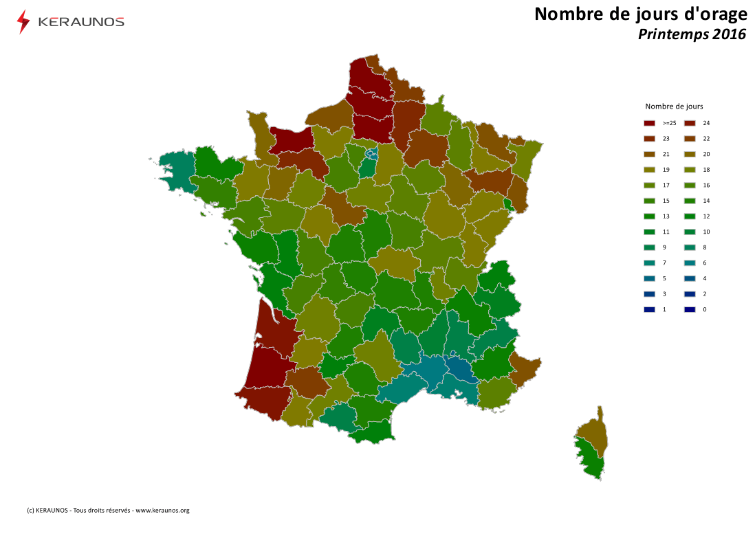 C'est sur le département des Landes que l'activité orageuse a été la plus fréquente avec 31 jours d'orage soit un tiers du printemps. Ensuite, c'est dans le nord que les orages ont été les plus fréquents avec 25 à 26 jours d'orage sur la Somme, le Calvados, l'Oise et le Pas-de-Calais.