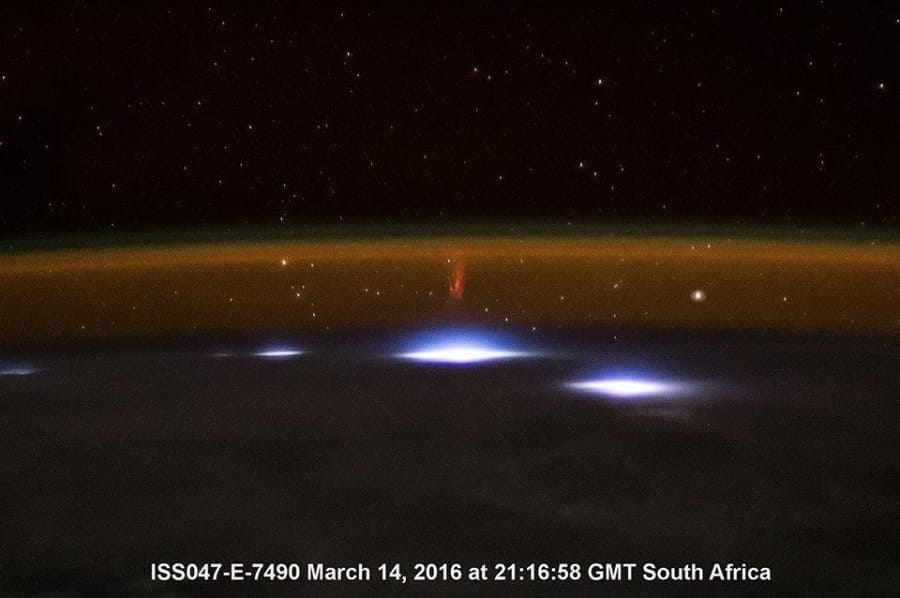 Des sprites ont été photographiés depuis la Station Spatiale Internationale au-dessus de l'Afrique du Sud le 14 mars :