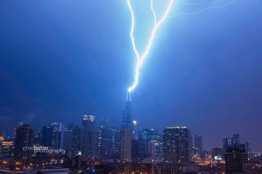 Durant la nuit, Chicago a été balayée par des orages. Un impact de foudre a frappé la plus haute tour de la ville :