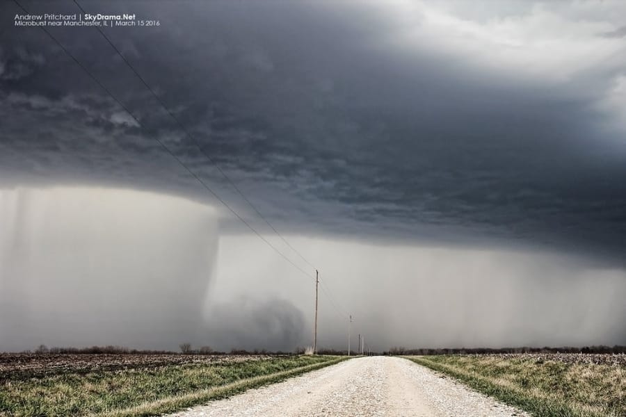 Toujours le 15 mars, une spectaculaire microrafale a été photographiée par Andrew Pritchard près de Manchester, dans le même état de l'Illinois :