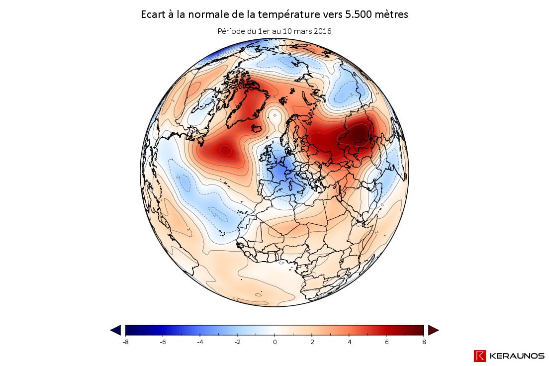Plus à l'est, l'anomalie douce exceptionnelle en place depuis février se maintient, avec des températures supérieures aux normales de 5 à 6°C sur l'est de l'Europe, jusqu'au Kazakhstan :