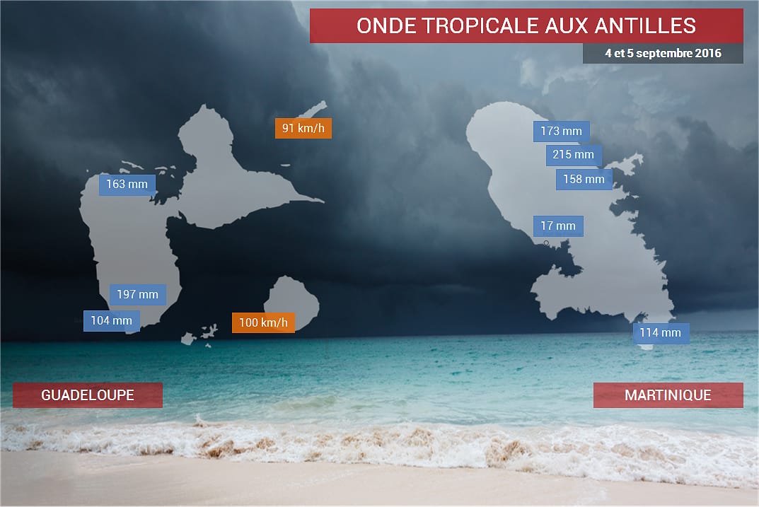 Ainsi, des cumuls ponctuels proches voire supérieurs à 200 mm ont été relevés sur les deux îles (215 mm à Sainte-Marie et 173 mm au Marigot en Martinique ou 197 mm à Saint-Claude et 163 mm à Sainte-Rose en Guadeloupe).