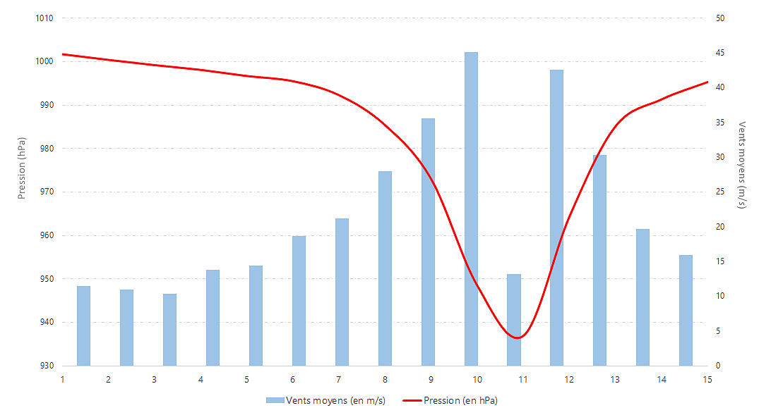 Graphe combiné vent moyen/pression - les heures locales figurent en abscisse - Données JMS