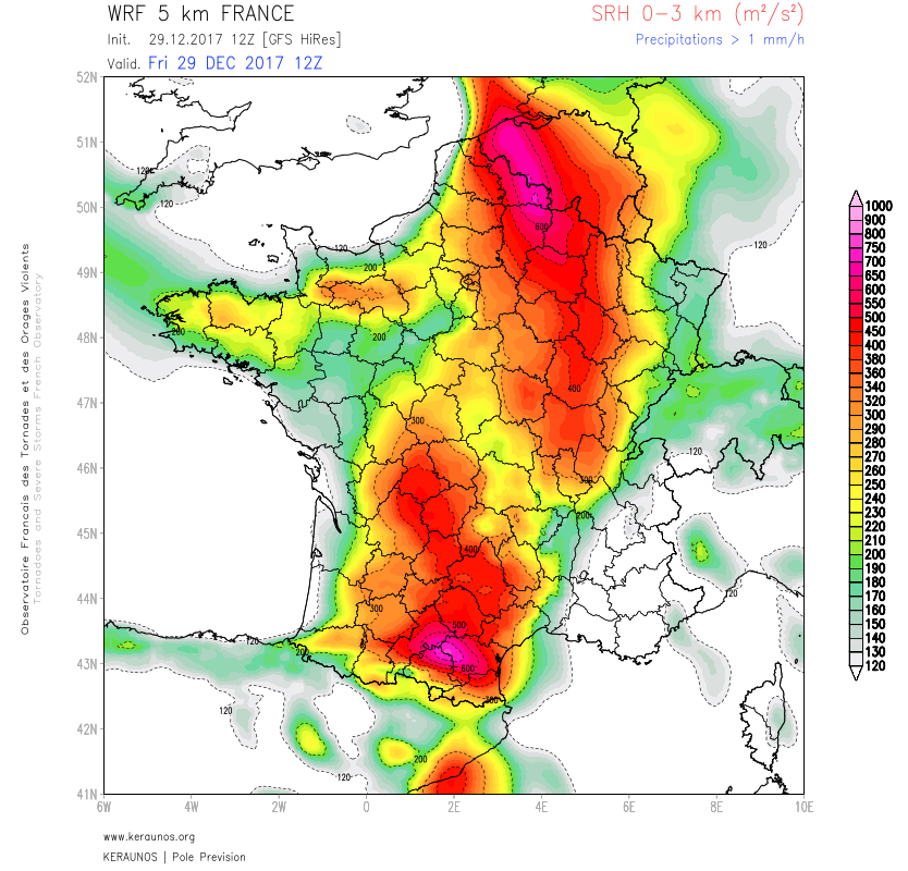 Une instabilité marquée pour une situation de masse d'air froid s'est ainsi mise en place (ci-dessous à gauche), dans un contexte par ailleurs bien cisaillé en basses couches (hautes valeurs de SRH 0-3 km, identifiables sur le champ du modèle WRF 5 km France ci-dessous à droite). L'ensemble a assuré des conditions favorables à une convection parfois profonde et active.