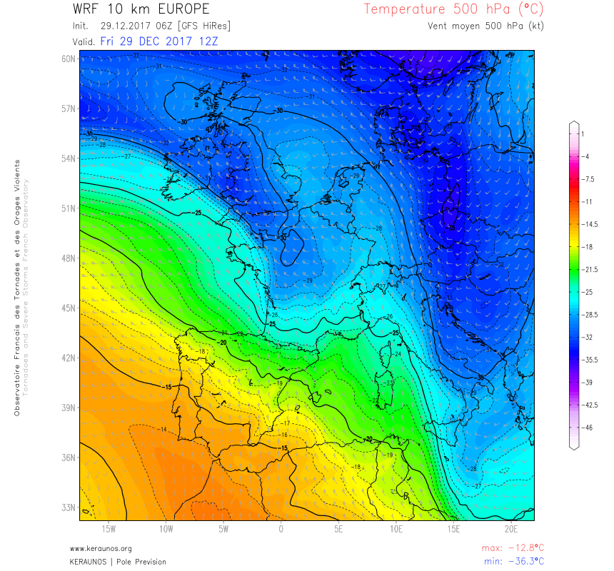 L'irruption d'une masse d'air polaire bien froide en altitude ce vendredi 29 décembre, par la Manche, a généré des développements orageux passagèrement actifs de la Normandie au Centre et au sud de la Lorraine. C'est principalement sur le nord-ouest du pays que l'activité orageuse s'est révélée localement virulente, notamment en raison de la production de puissantes rafales de vent descendantes, qui ont parfois dépassé 130 km/h, comme à Alençon où une rafale de 133 km/h a été mesurée peu avant 15h00 locales.