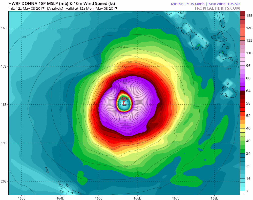 Le cyclone tropical Donna a connu une phase d'intensification plus significative ces dernières heures. D'équivalent catégorie 4, il est ce matin du 8 mai situé au nord-ouest de la Nouvelle Calédonie et se dirige vers les îles Loyauté qu'il touchera d'ici 12 à 18h en faiblissant graduellement.