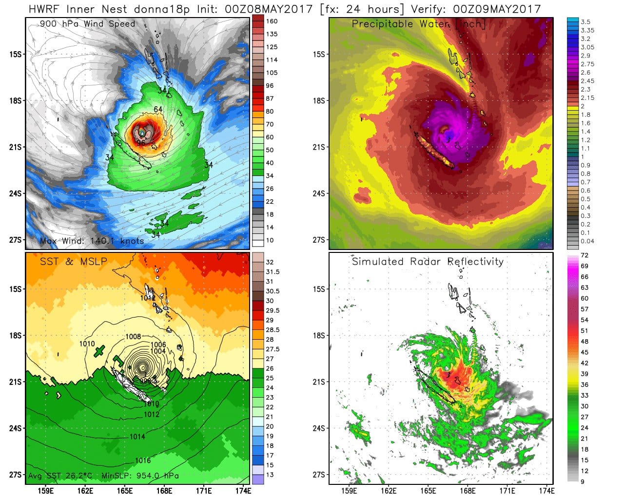 Le modèle HWRF 4 km met en évidence l'arrivée du cyclone la nuit prochaine sur l'ouest des îles Loyauté. Des vents soutenus sur 1 minute proches de 240 km/h à basse altitude (900 hPa) sont envisagés par le modèle :