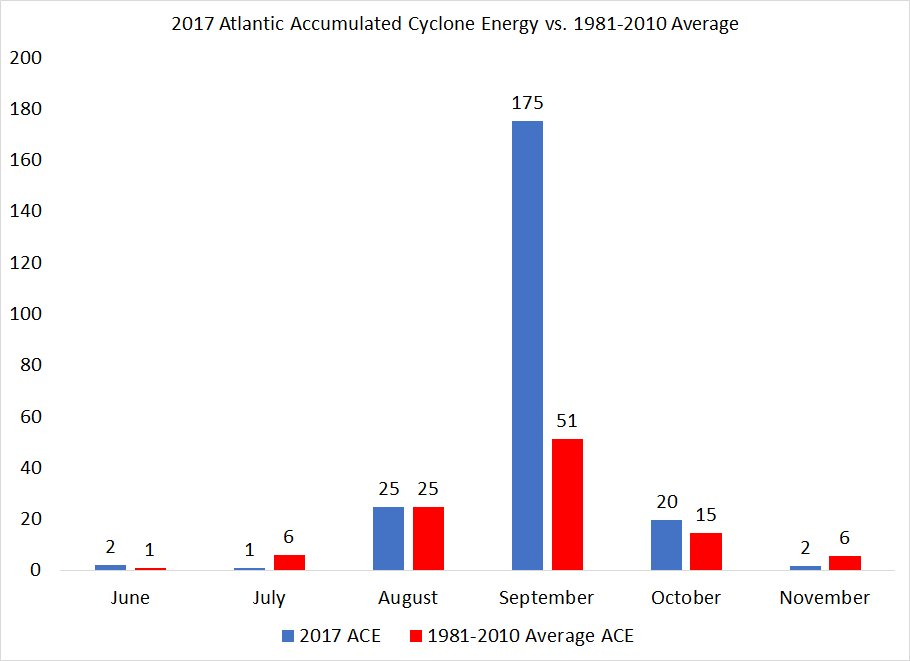 Parmi les 10 ouragans, 6 ont atteint ou dépassé la catégorie 3 (stade d'ouragan majeur). Deux d'entre eux ont atteint la catégorie 5 (Irma et Maria). Le pic de la saison s'est clairement établi en septembre. En effet septembre 2017 a été le mois de septembre le plus actif (depuis le début des observations) en terme d'activité cyclonique sur le bassin Atlantique. L'énergie cyclonique cumulée a battu un record mensuel à 175, soit une valeur près de 4 fois supérieure à la normale 1981-2010 d'après Philip Klotzbach :
