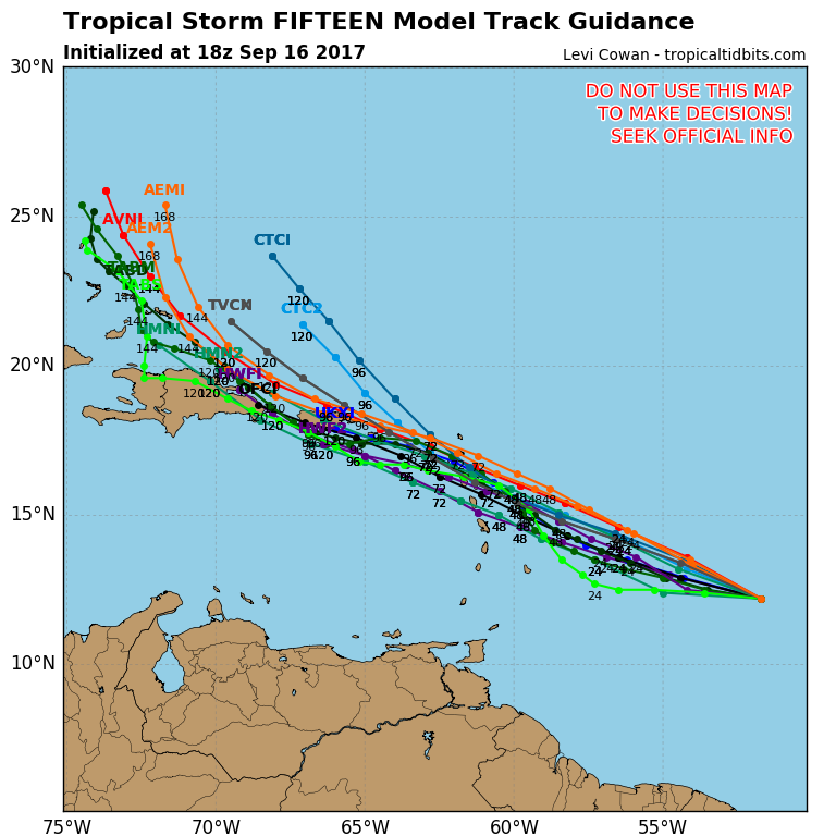 La prévision de trajectoire et d'intensité reste encore un peu incertaine. Le modèle d'ensemble européen est le plus au sud, faisant passer Maria sur la Guadeloupe. La plupart des autres modélisations envisagent un passage un peu plus au nord. Et de façon plus extrême, le dernier modèle américain et HWRF impactent directement les îles du nord (Saint-Martin/Saint-Barthélémy).