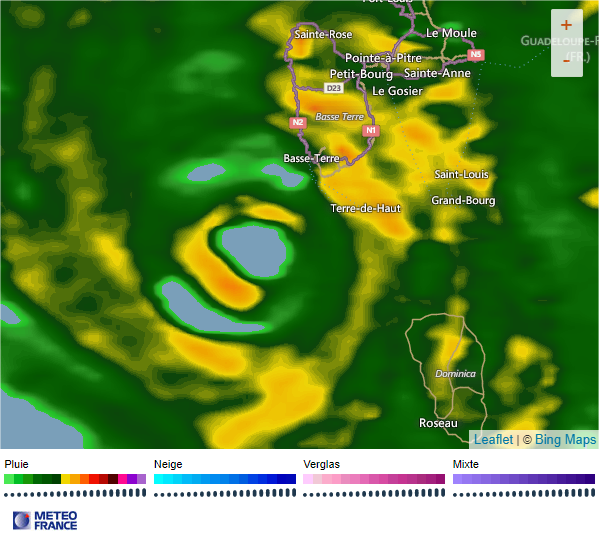 Maria évolue à présent très près de l'archipel des Saintes avec lequel le contact a été perdu tôt ce matin. Le mur de l’œil de Maria n'est qu'à quelques km de Terre-de-Bas et passera au plus près de Basse-Terre dans les heures à venir :