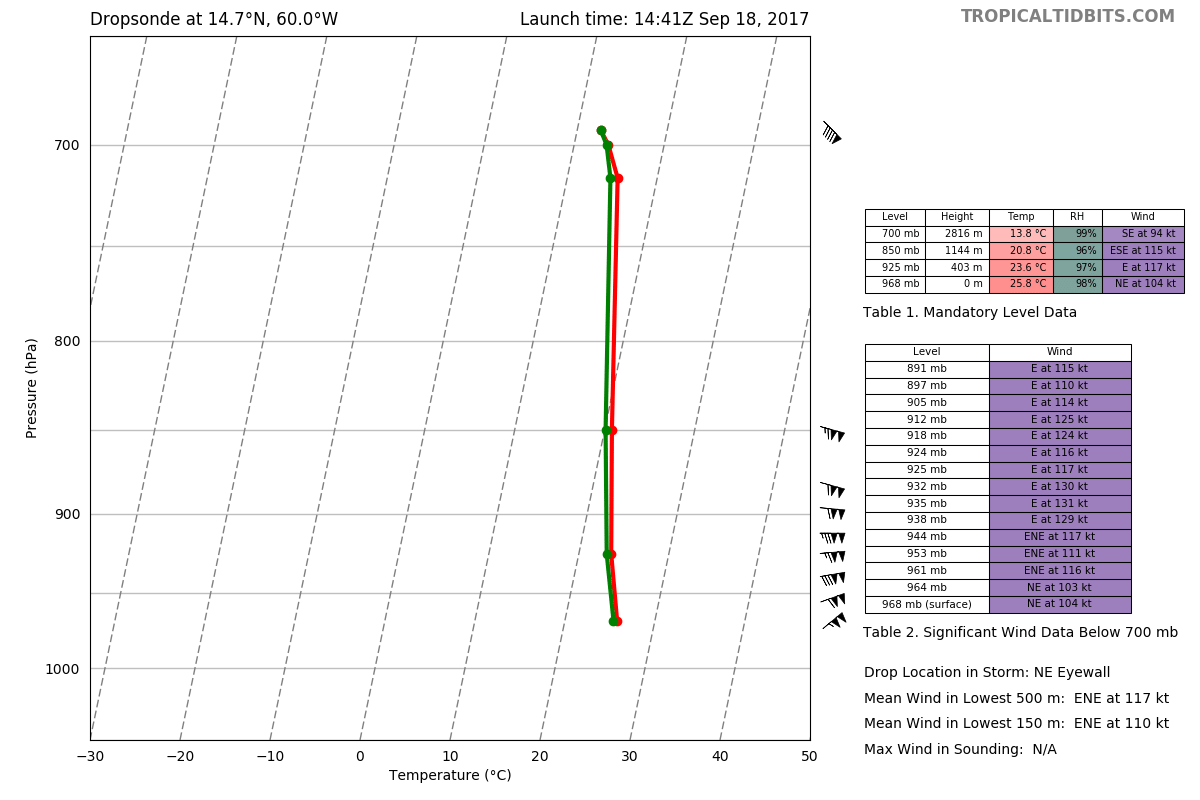 Une dropsonde, lancée dans le quadrant sud-est de Maria a fini dans le quadrant nord-est et a relevé des vents en surface de 105 nœuds en fin d'après-midi :