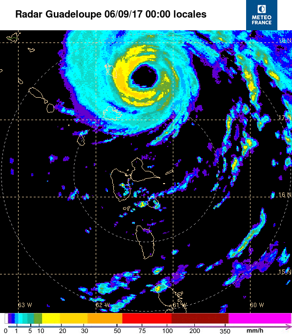 L'image radar de la Guadeloupe montre un ouragan toujours très intense avec deux murs concentriques, ce qui pourrait signifier qu'un cycle de remplacement du mur de l’œil est en cours. L'oeil est toujours assez large, de l'ordre de 40 km de diamètre environ et ne se contracte pas encore :
