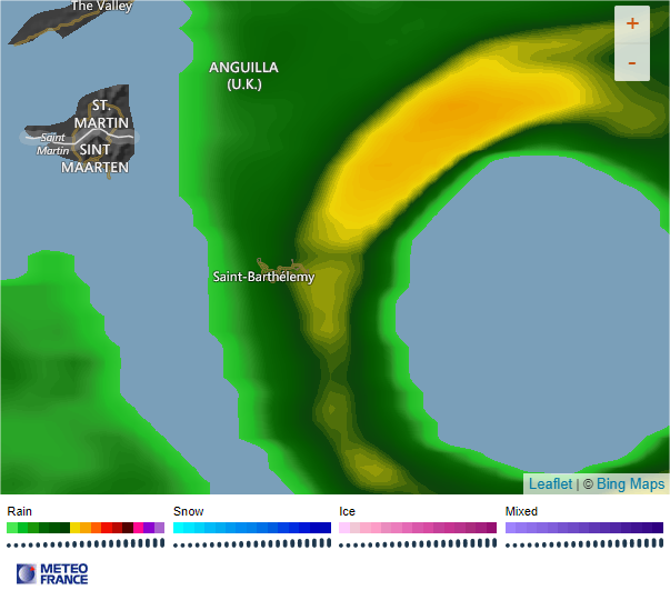 La prévision pour les îles du nord et Anguilla reste pessimiste avec des conditions extrêmes prévues entre 6h UTC et 15h UTC ce mercredi. Des vents moyens sur 10 minutes > 150 km/h et des rafales à près de 250 km/h sont envisageables. La houle cyclonique attendue devrait être destructrice avec des creux > 14 m en mer. Enfin, de fortes pluies sont prévues avec des cumuls pouvant atteindre 200 mm voire plus par endroit.