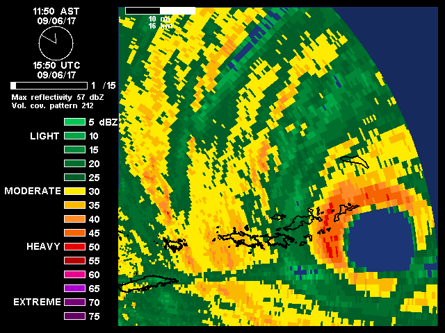 L'image radar de Porto-Rico montre l'impact d'Irma sur les îles Vierges anglaises et le nord des îles Vierges américaines. Une rafale de 144 km/h a été relevé à Saint-Thomas avant que l'anémomètre ne cesse d'émettre :