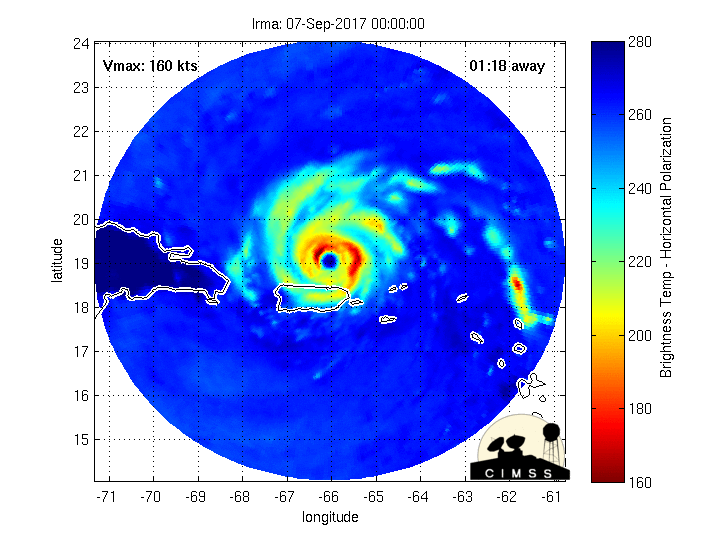 En cette fin de soirée, le quadrant sud-ouest d'Irma semble moins perturbé par de l'air sec avec l'éloignement de l'île d'Hispaniola. Ainsi, la convection et l'afflux en humidité s'est à nouveau bien organisé dans les quatre quadrants. En l'absence de reconnaissance depuis la fin d'après-midi, l'intensité d'Irma reste supposément la même.